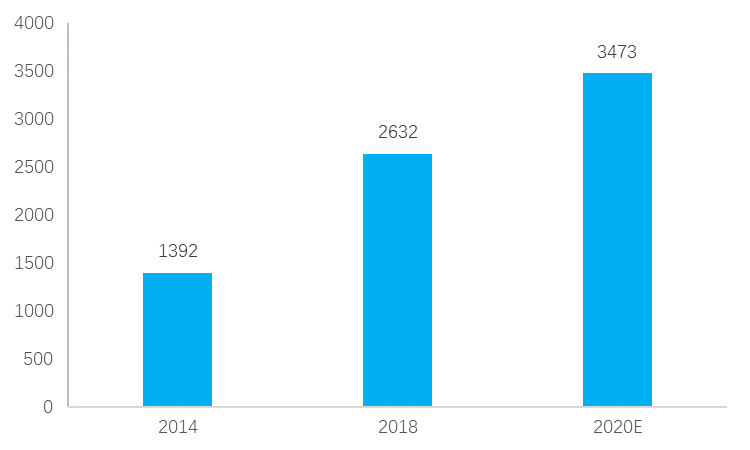 图3-12:2014年和2018年国内环卫市场规模及预测(亿元)