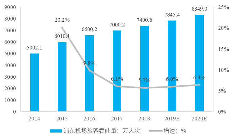 图2-8:2012-2020E年上海浦东机场旅客吞吐量及预测   数据来源:上海机场年报