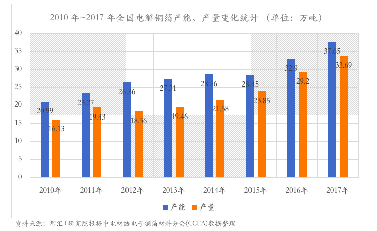 图2-6:2010年~2017年全国电解铜箔产能、产量变化统计