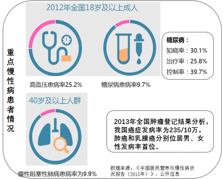 目前我国慢性病确诊患者已超2.6亿人,死亡人数占总死亡人数的85%。据全国第三次死因调查显示,在我国,排名前四位的死因为脑血管病、恶性肿瘤、呼吸系统疾病和心脏病,慢性病死亡率为503/10万。截至2018年,中国成人高血压患病率达25.2%,患者人数约2.7亿,糖尿病患病率12%。