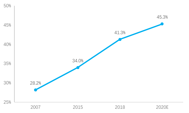 图2-1:2007-2020E年我国经常参加体育锻炼人口占比 资料来源:国家体育总局、iResearch