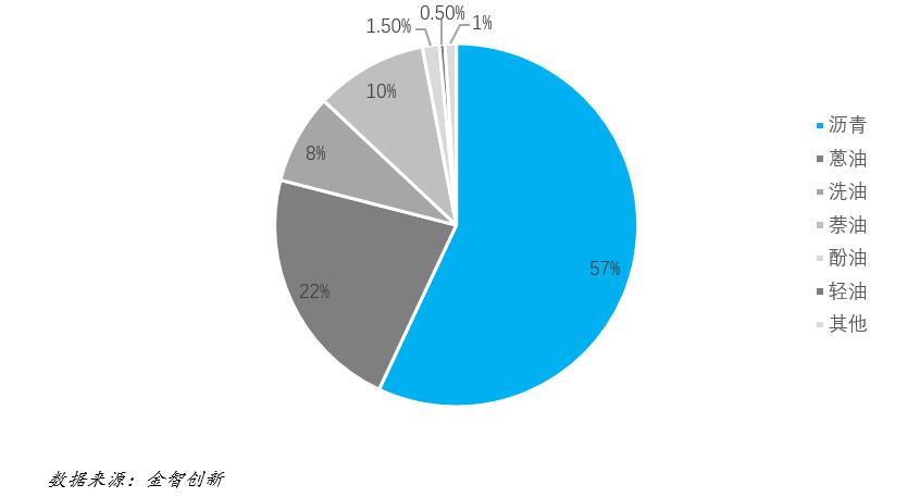 其中,煤焦油深加工产品沥青和蒽油市场需求最大。目前国内煤焦油深加工下游需求主要以沥青、蒽油、洗油、萘油、酚油和轻油为主。沥青和蒽油占比较高,分别为57%和22%。